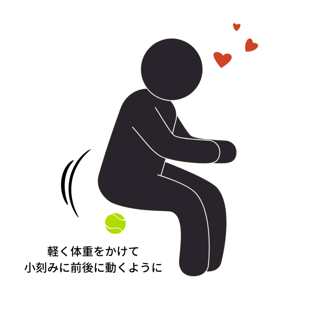 クッションを用意して、タオルを敷いてテニスボールを置いて会陰の部分にあててゆっくり体重をかけながら座る。
